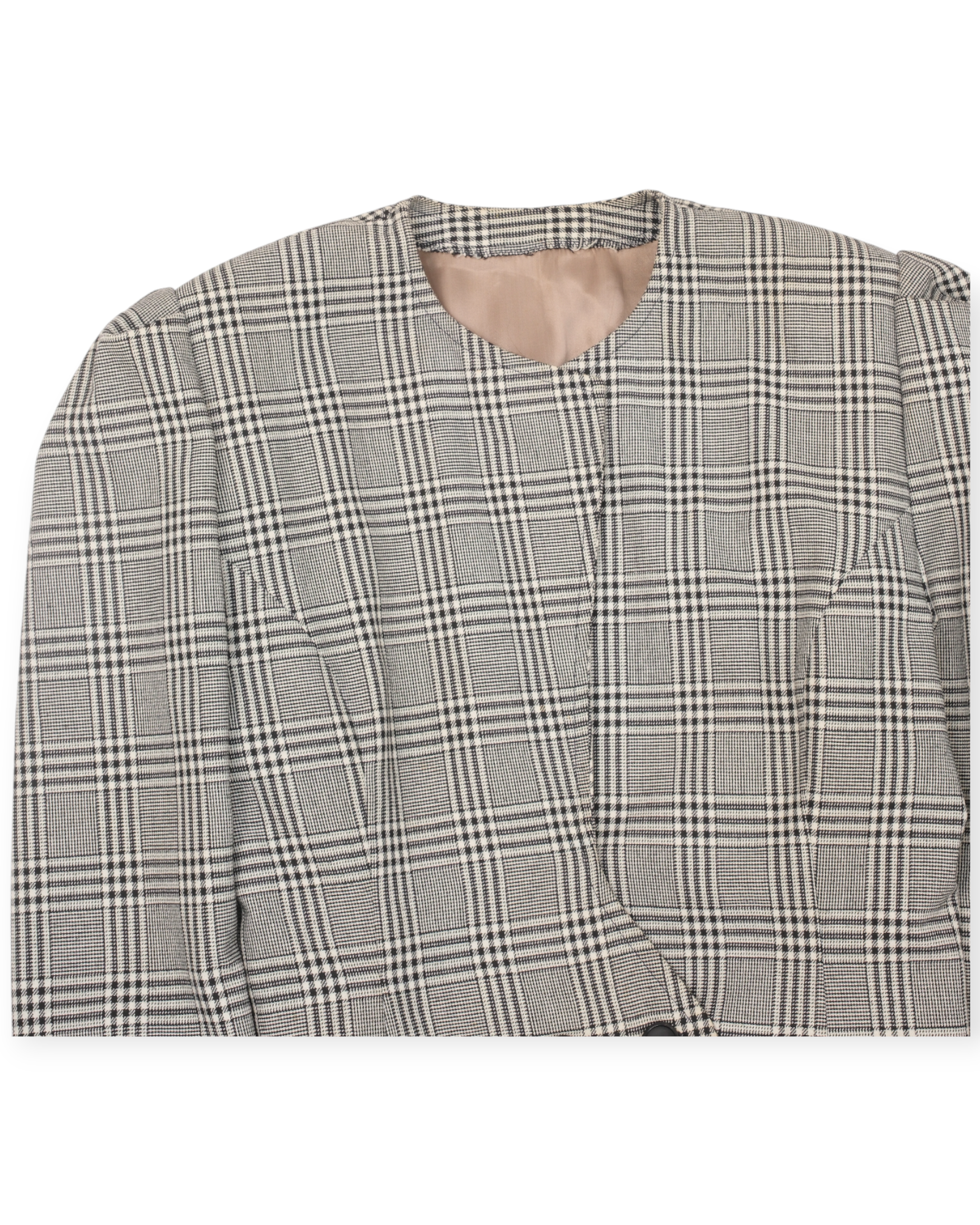 Grey checked cropped blazer with a two-button front closure. The jacket has a fitted shape, structured shoulders, and a light beige inner lining.