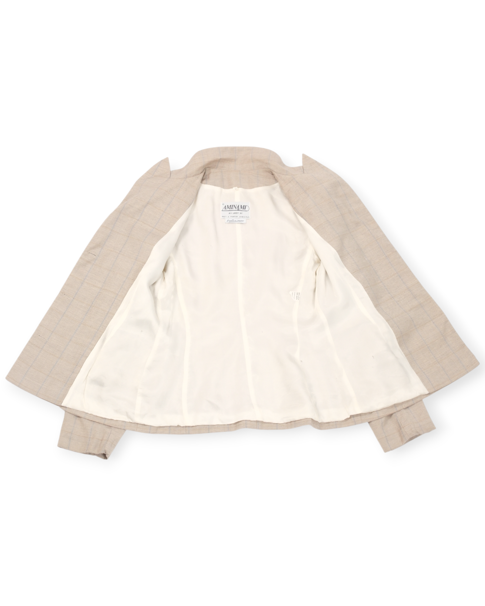 Beige single-breasted blazer from Aminami by Lady Gi, made in Italy. The blazer has a light checked pattern, three front buttons, and flap pockets. Made from a wool and silk blend with a smooth inner lining.