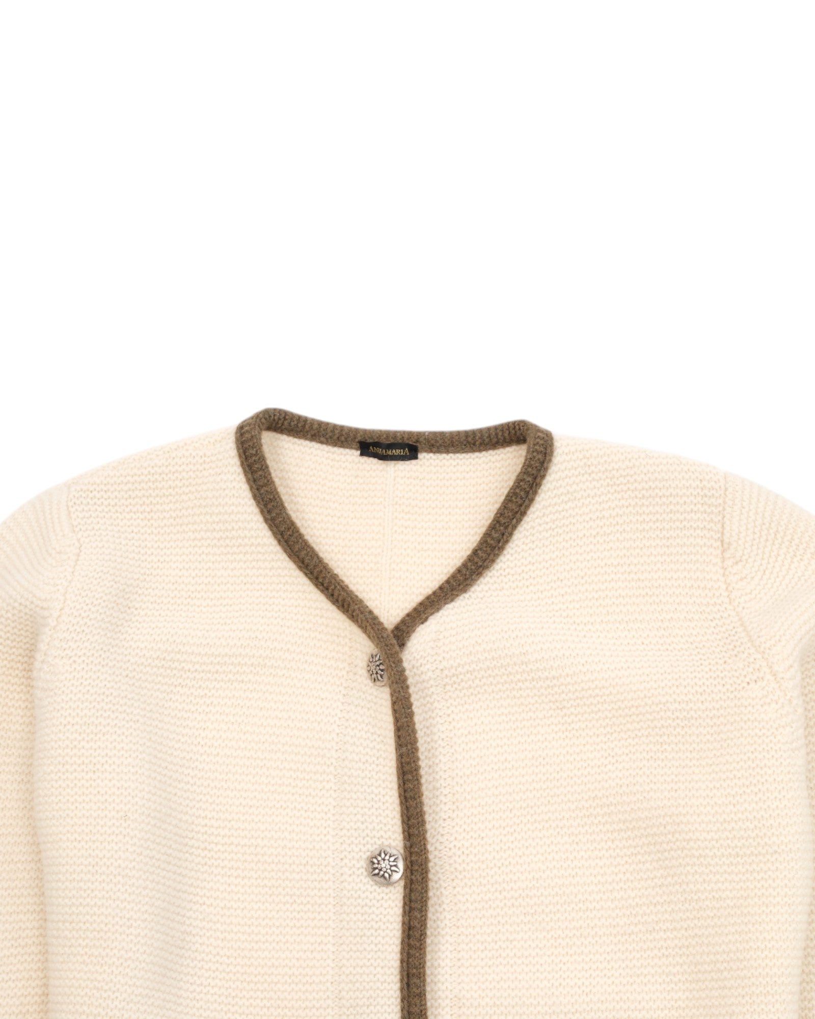 Classic knitted cardigan in natural white with decorative brown edging. Silver-colored metal buttons with a floral motif add an elegant, alpine touch. Two small front pockets. Labeled "AnnaMaria".