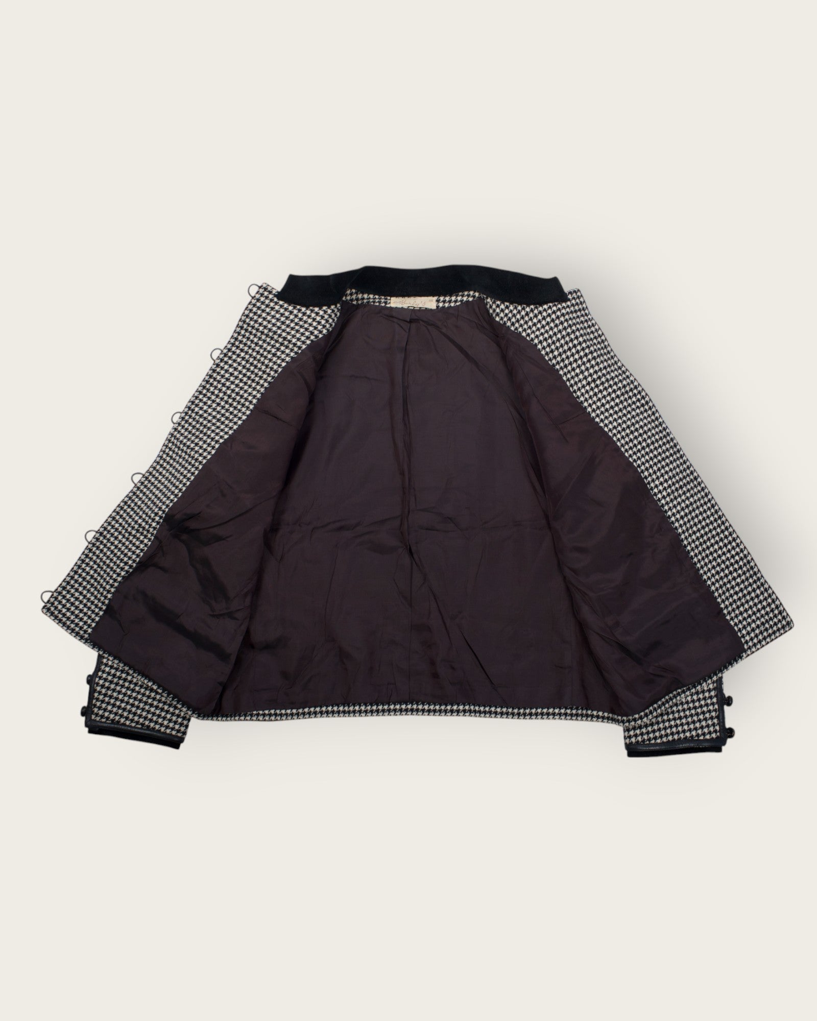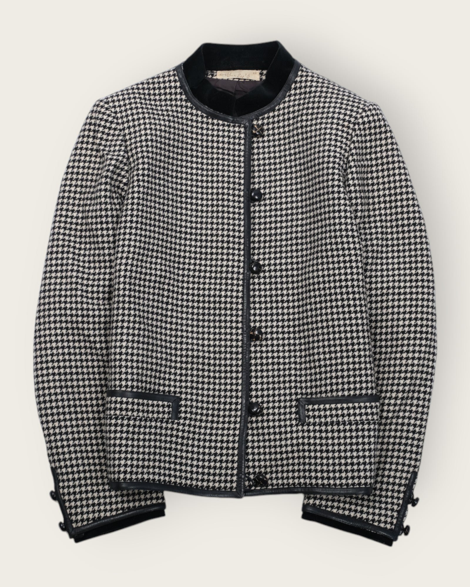 A sophisticated black and white houndstooth wool jacket with a luxurious black velvet mandarin collar and button cuffs. Trimmed with black piping and featuring elegant front pockets, this piece from Hardy’s (size 48) is a true nod to 60s Parisian chic. Fully lined in deep brown satin – a rare and timeless treasure.