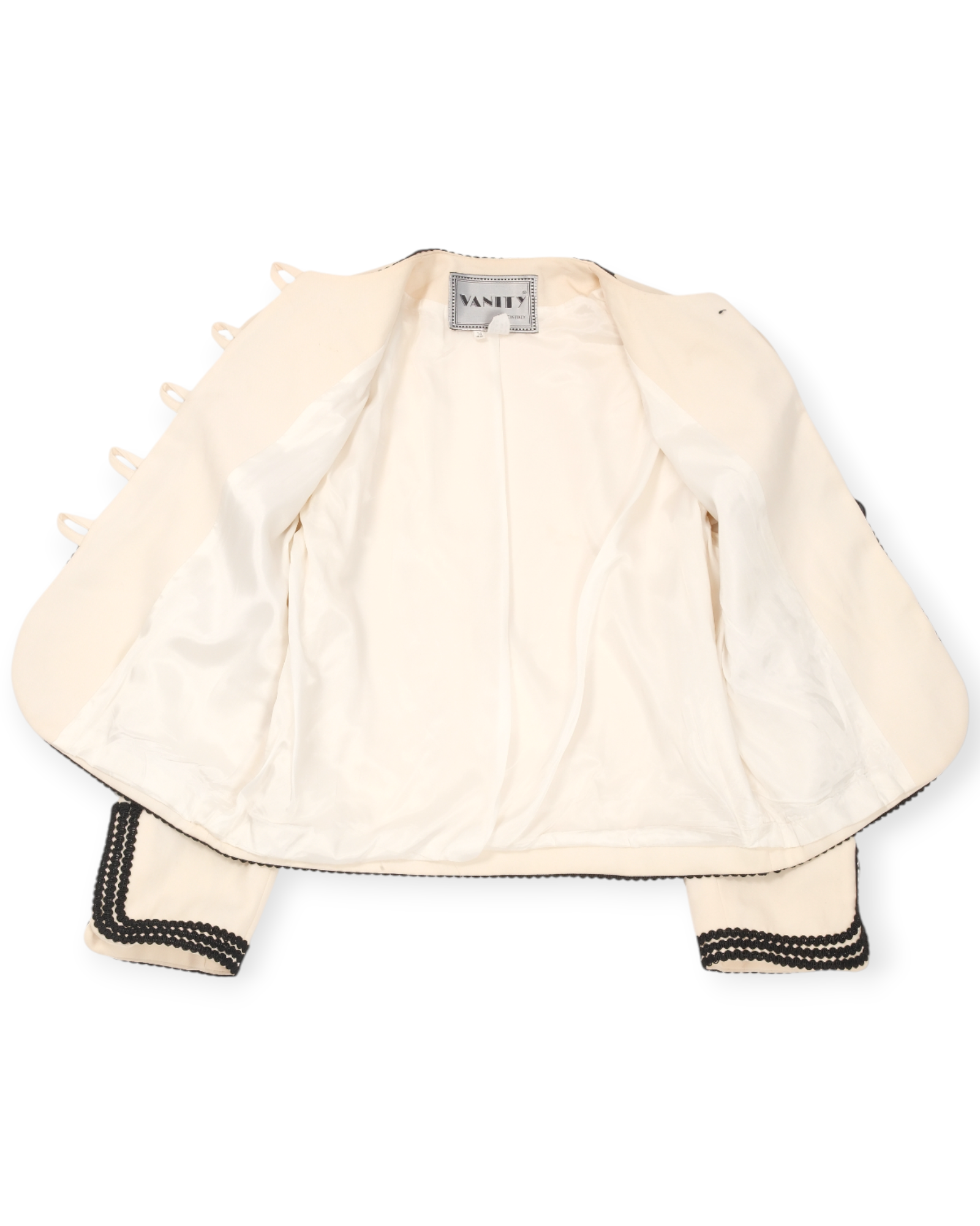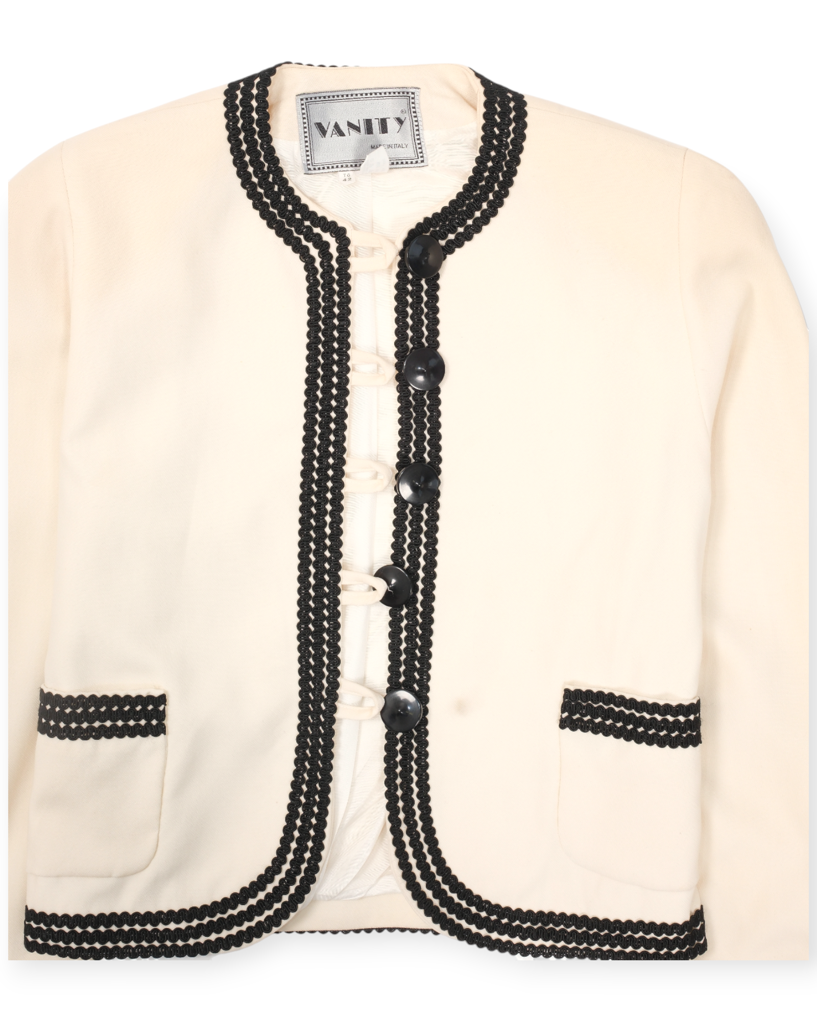 Cream-colored jacket from Vanity, made in Italy. The jacket features black trim detailing along the edges, front, and pockets. It has four front buttons and two front pockets. Made from a soft wool and silk blend with a smooth lining.