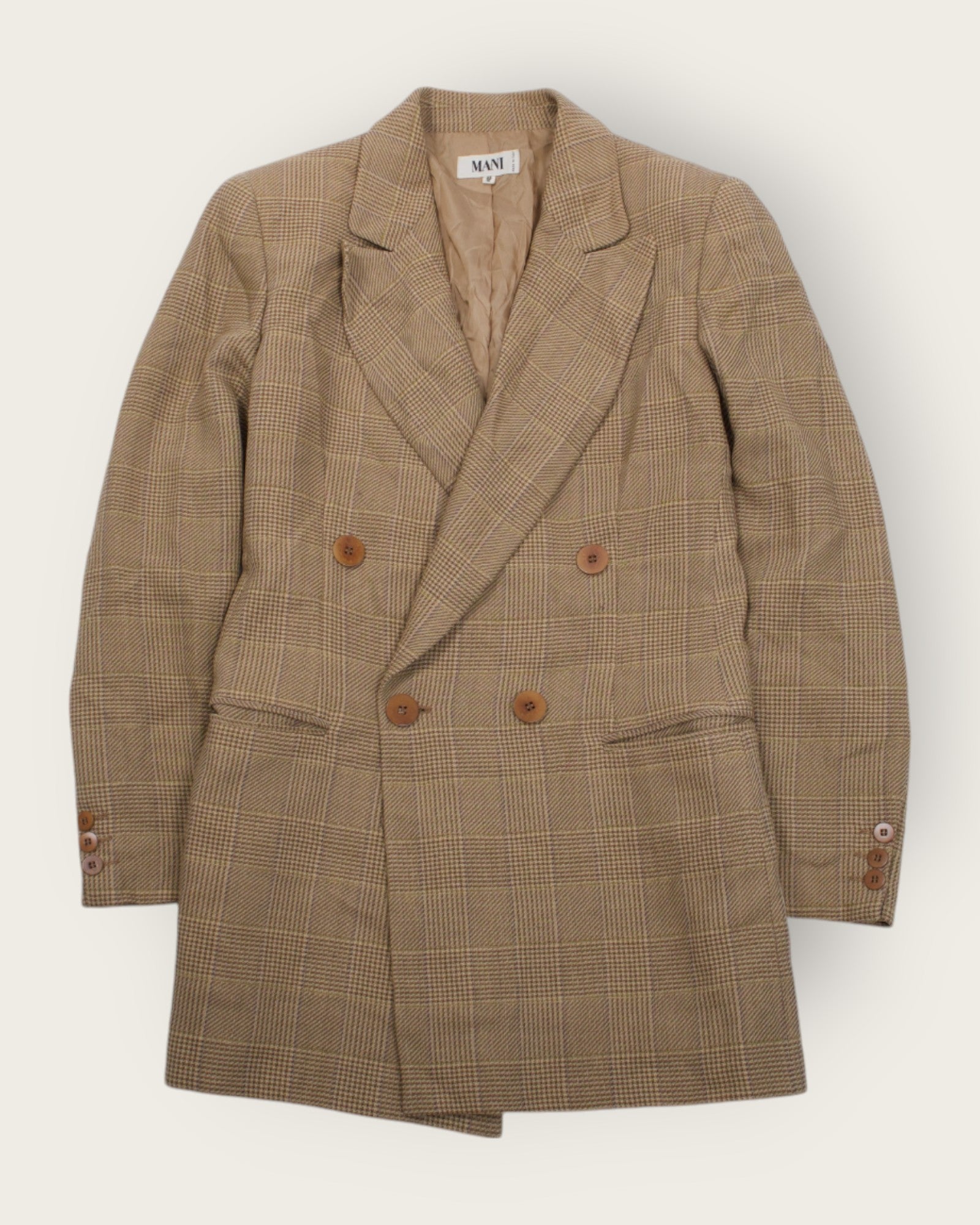 From the iconic MANI by Giorgio Armani line, this vintage double-breasted blazer exudes quiet luxury. Crafted in camel-tone Prince of Wales check with wooden buttons, broad shoulders, and a slightly elongated cut, it’s an elegant power piece that commands attention.