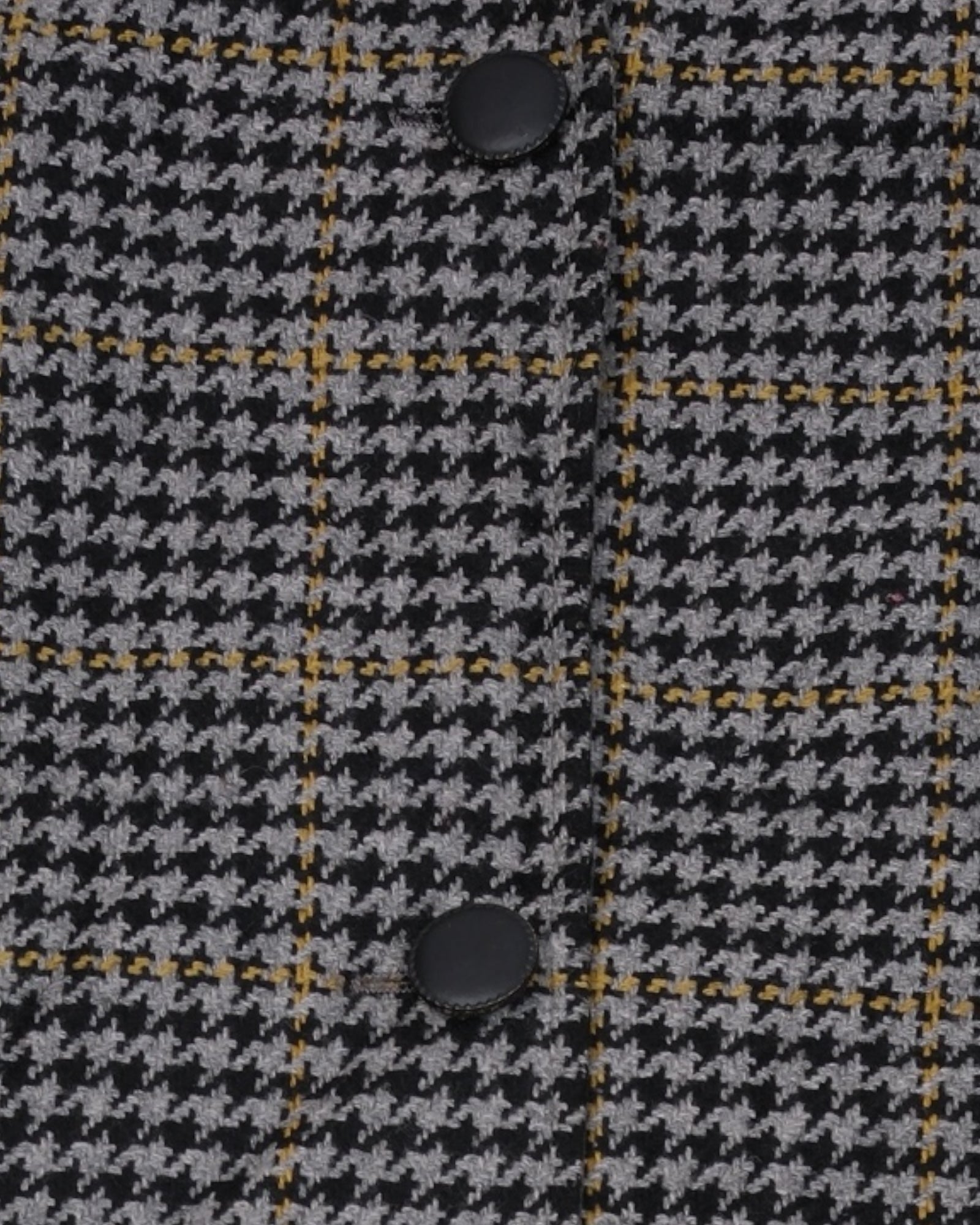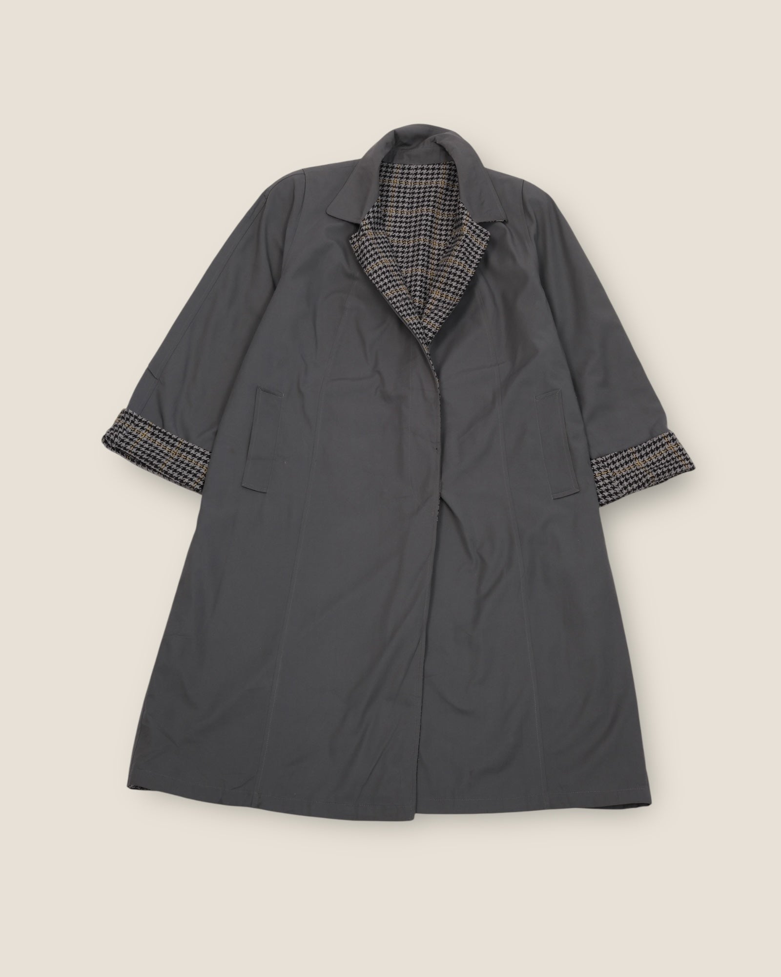 Type: Reversible coat. One side is solid dark gray, the other features a large check pattern (houndstooth-style with windowpane lines).