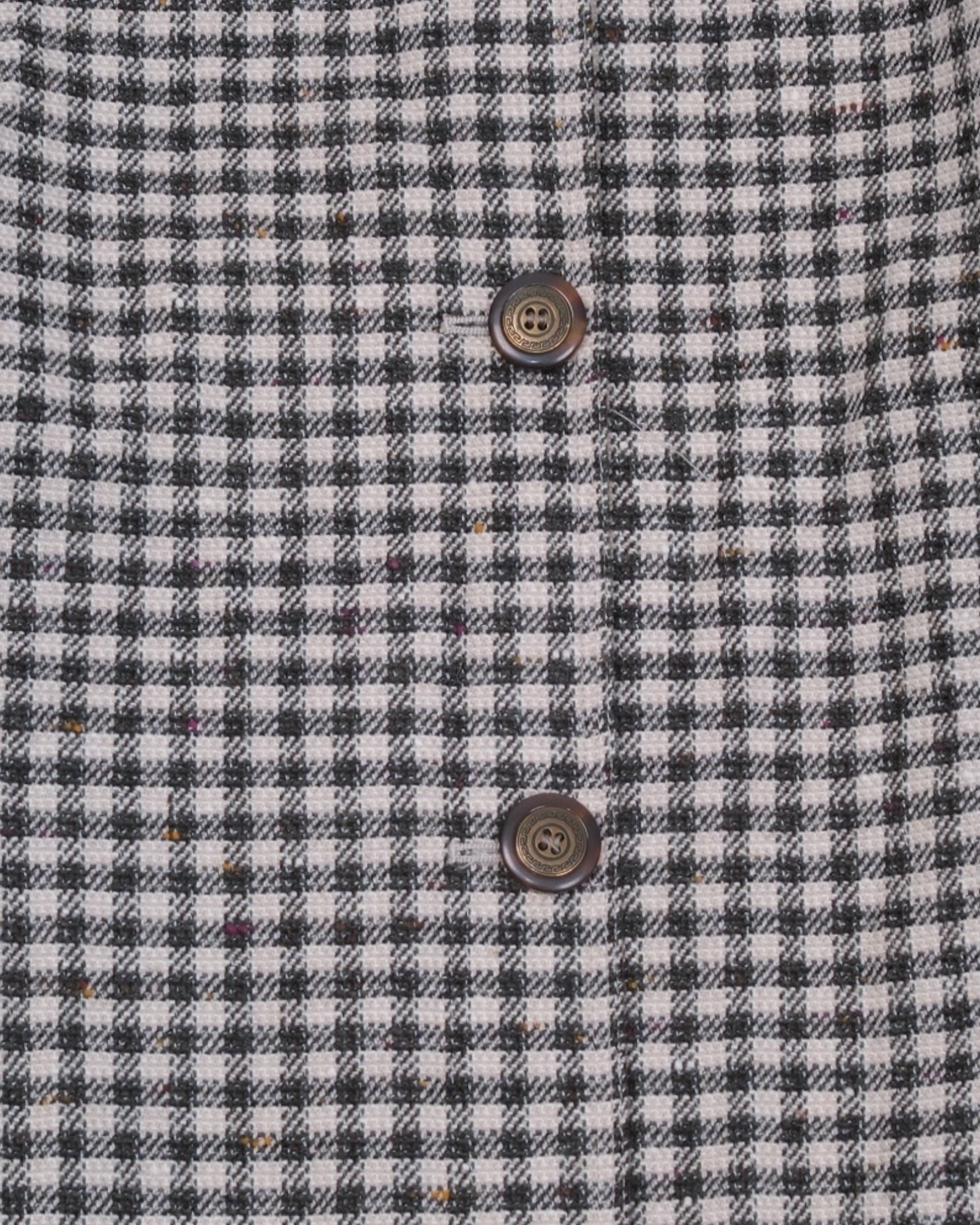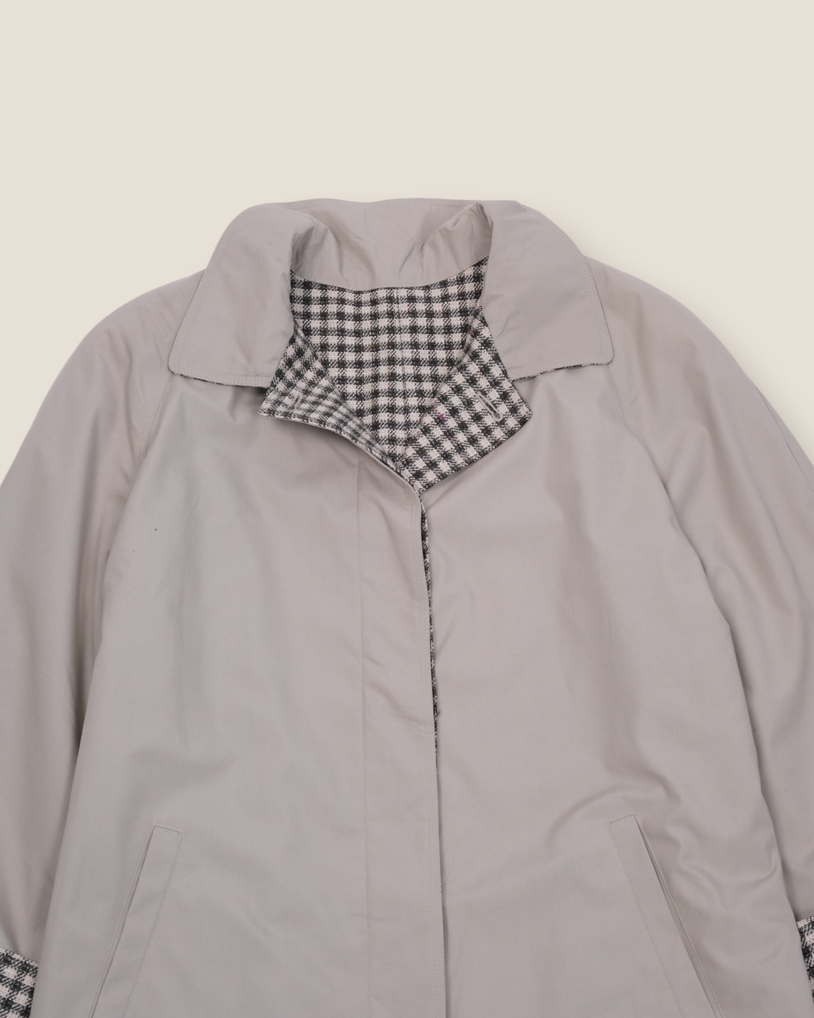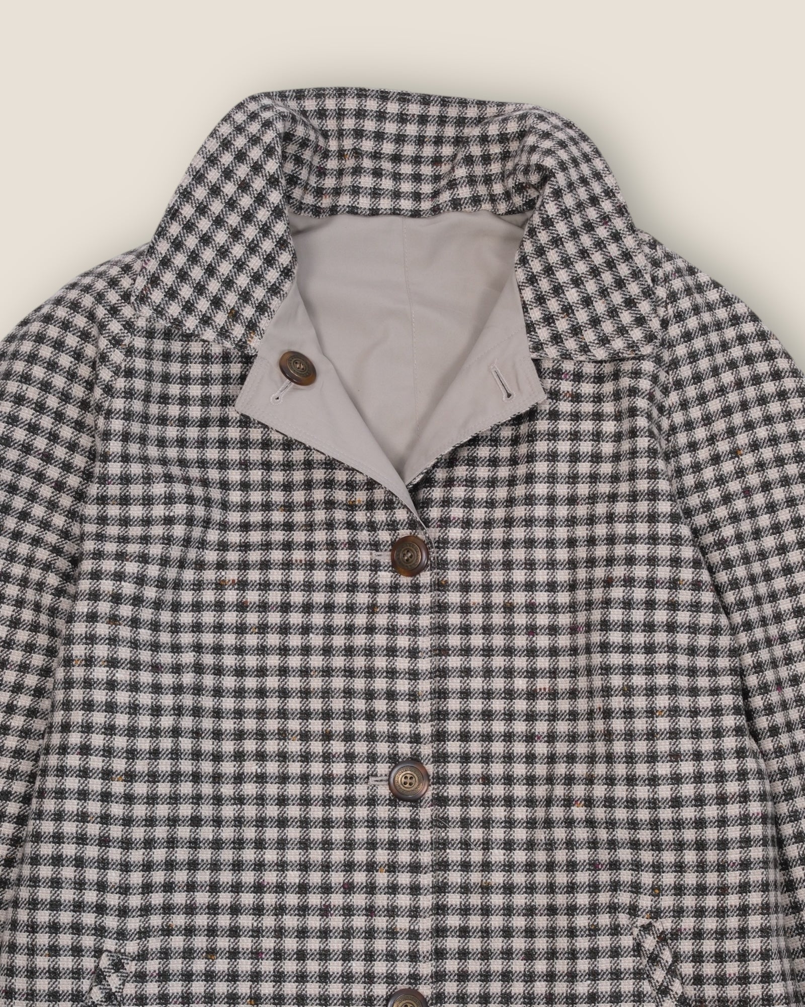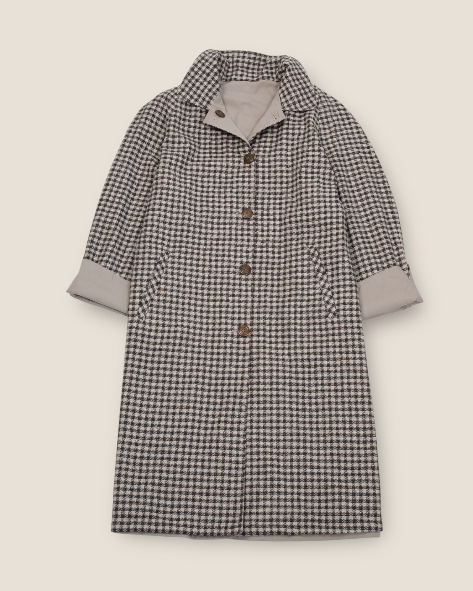 Reversible mid-length coat in good condition. No visible brand. One side features a classic check pattern, the other a solid color. Timeless design, practical and stylish