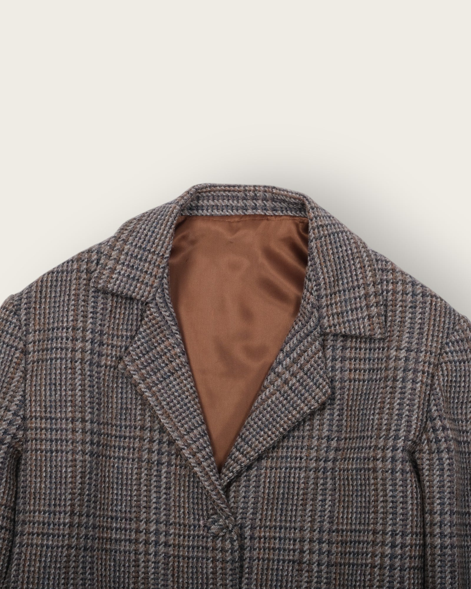 This vintage bouclé wool jacket features a stunning royal blue and black check accented by subtle multicolor threads.