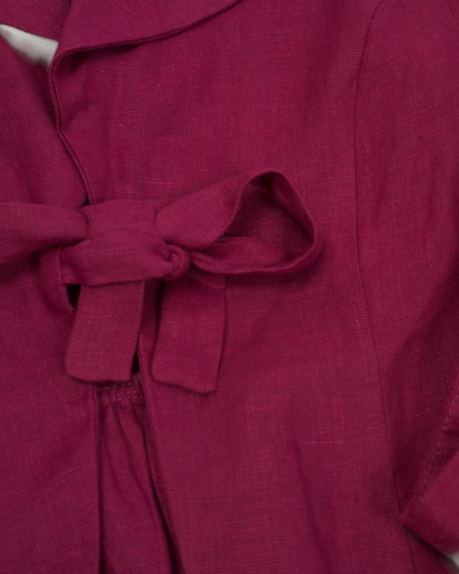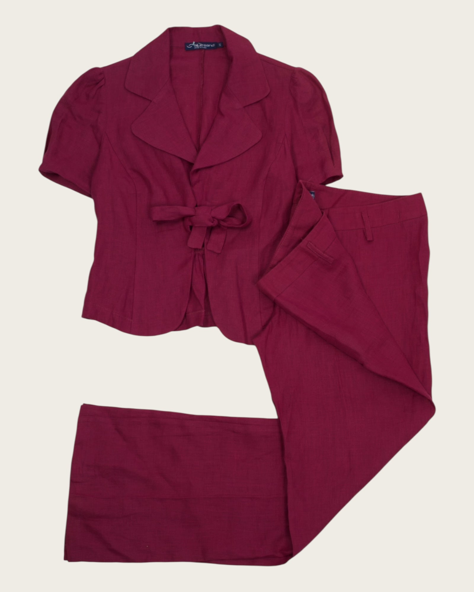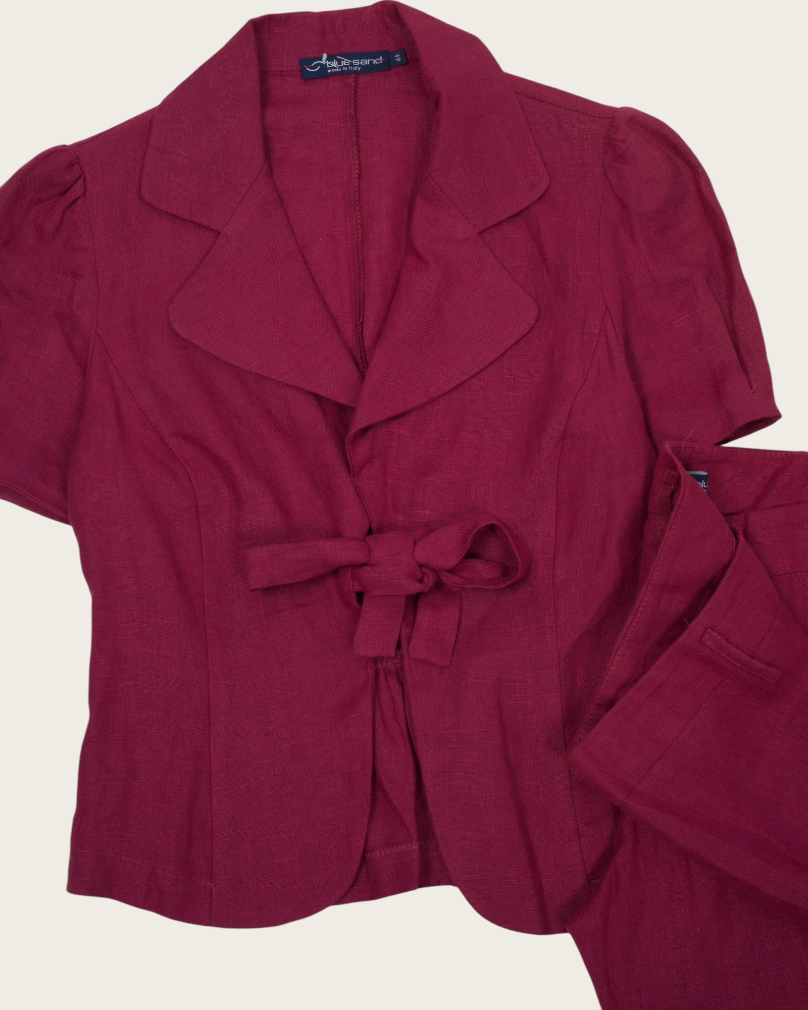 A charming blend of softness and strength, this berry red linen set by Sole & Sand is the perfect expression of feminine tailoring. The short sleeve top features sculpted shoulders and a flattering tie-front detail, while the coordinating trousers provide a balanced silhouette that's both easygoing and elegant.