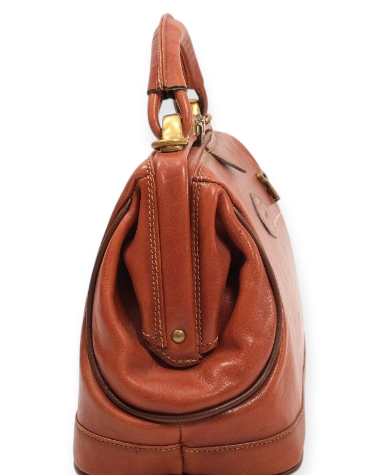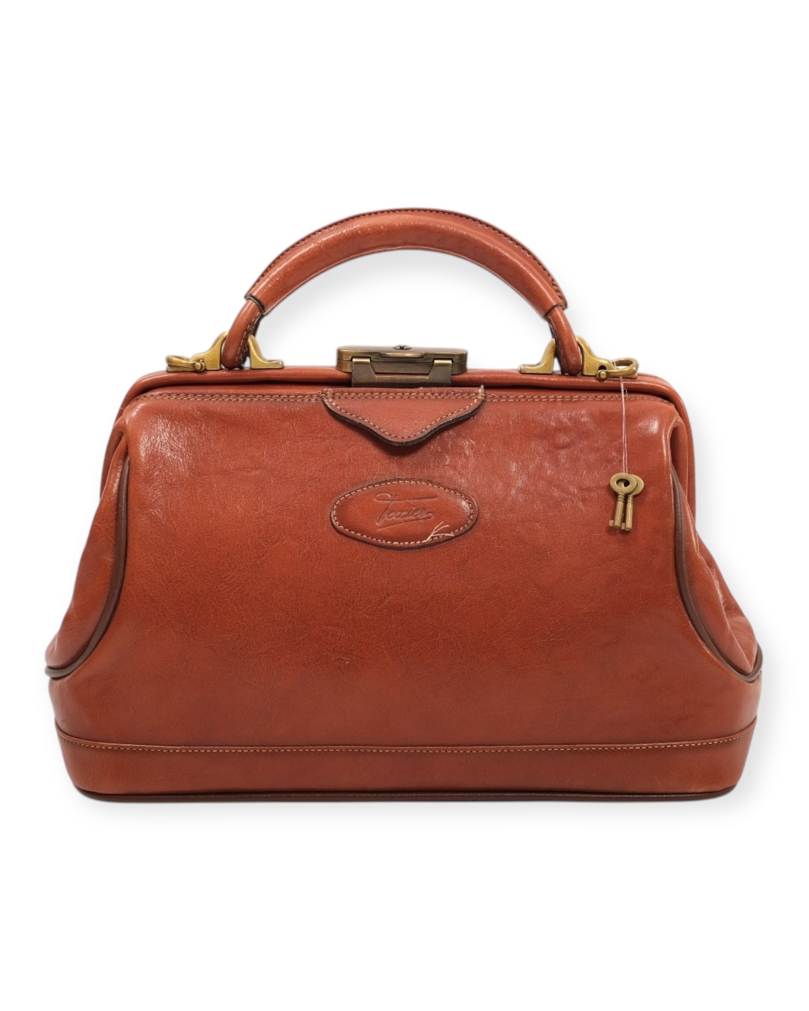 Crafted in France by the heritage leather house Texier, this structured doctor-style handbag embodies quiet luxury and enduring craftsmanship. Made from supple brown leather with a natural patina, it features a strong frame closure with gold-tone hardware and the original key – a detail that reflects its quality and care over time.