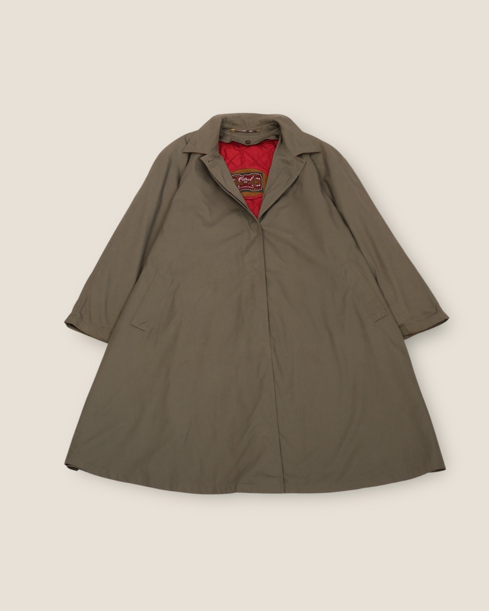 Vintage mid-length trench-style coat by Carol – Styled by Preca, a brand with roots in the Italian label Preca Brummel, known for elegant and practical outerwear. This piece features a striking red quilted lining, hidden button closure at the collar, and practical side pockets, designed for autumnal warmth and style. Excellent condition, with minimal wear.