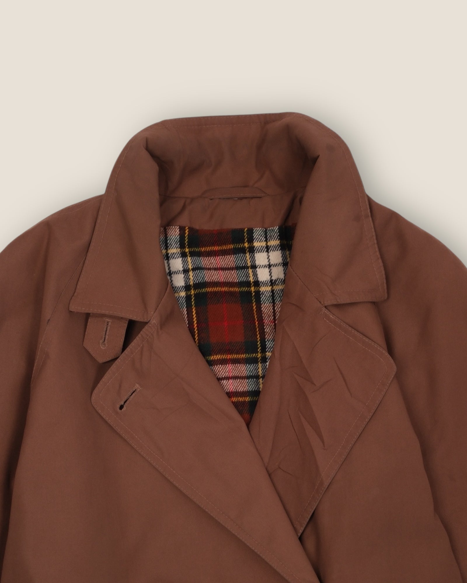 Classic vintage double-breasted trench in a rich chestnut brown, lined with a warm tartan plaid. Features a wide lapel collar, deep pockets, and six-button closure. Timeless style with a hint of British heritage influence. Good condition