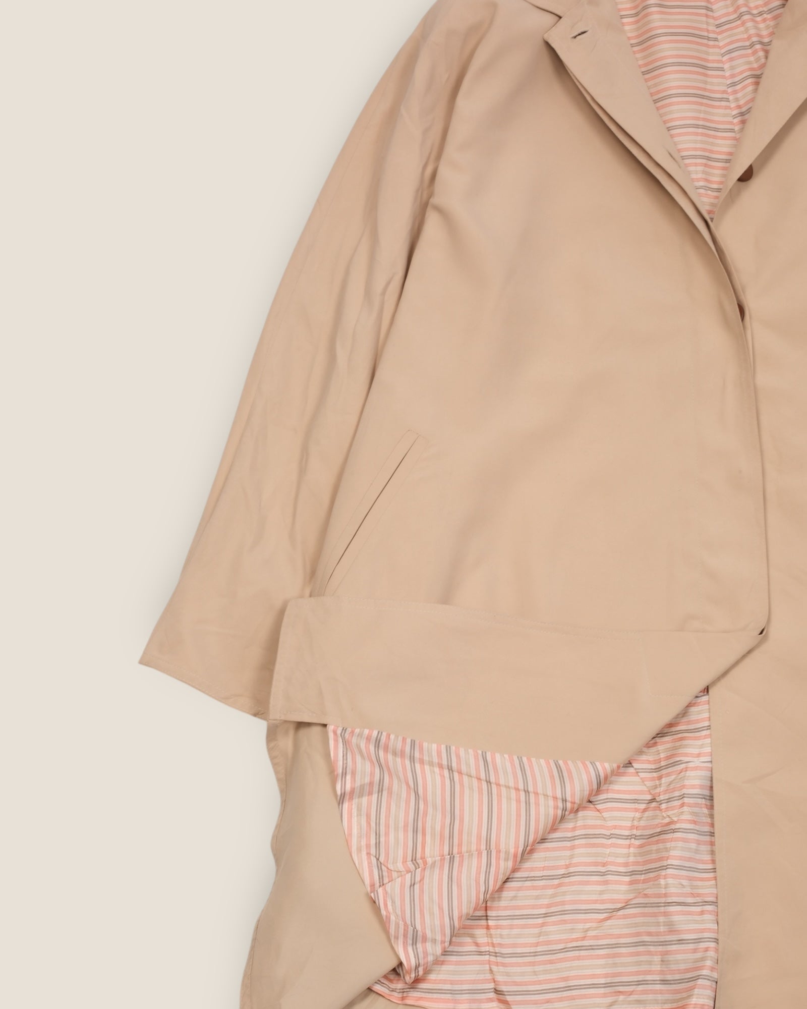 Minimalist vintage beige coat with a soft pink-and-white striped lining. A-line silhouette, mid-length, with concealed button closure. Lightweight and versatile, ideal for spring wear. Excellent condition